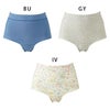 カラーは、花や葉を繊細なタッチで表現したプリント柄(IV)、ブルー無地(BU)、杢グレー無地(GY)の3色。